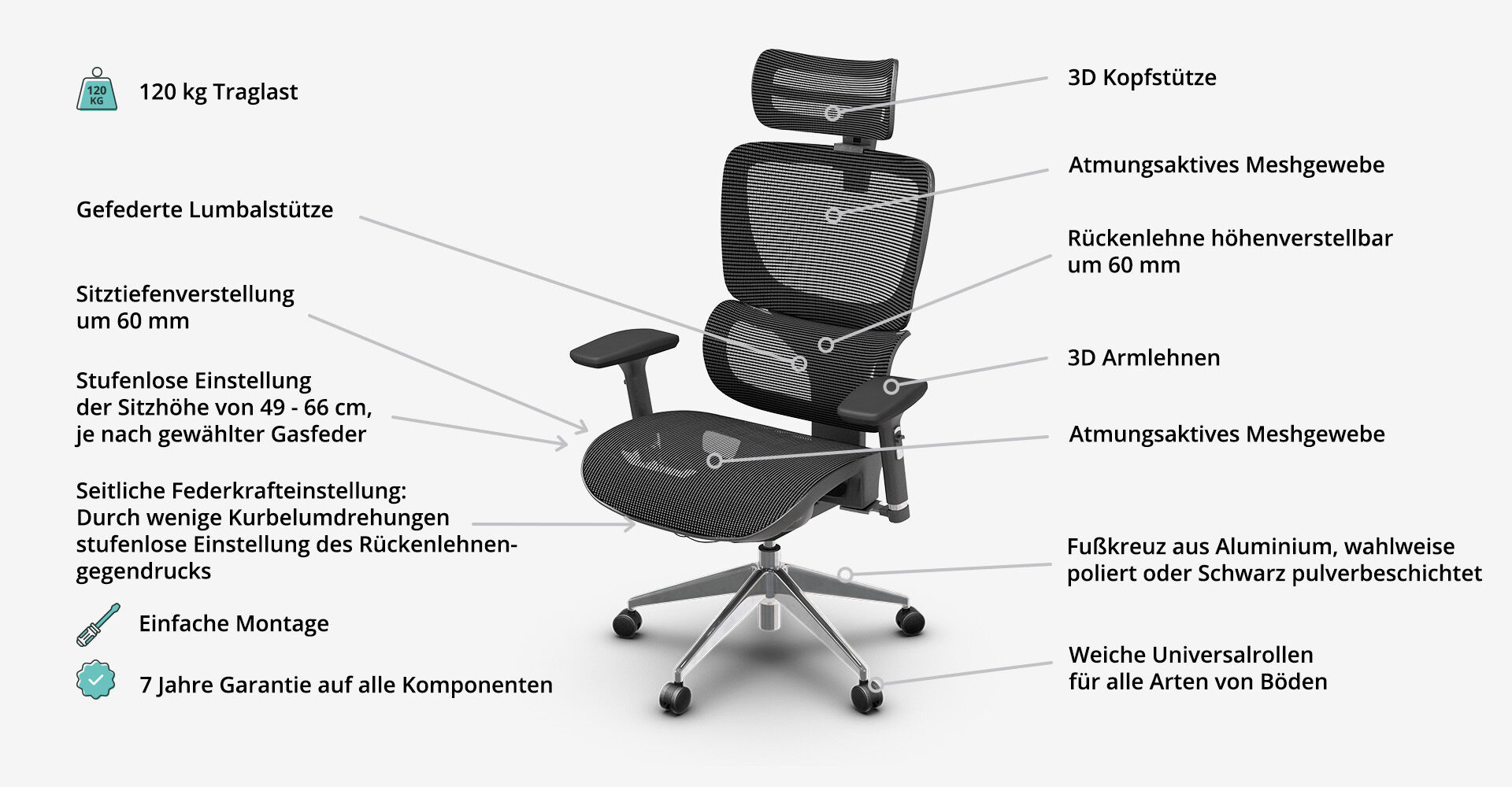 Sowohl Rückenlehne als auch Sitzfläche sind mit Mesh Gewebe bezogen und garantieren einen angenehm atmungsaktiven Sitzkomfort. Der Mesh Bezug sorgt auch bei hohen Temperaturen für eine hervorragende Luftzirkulation und vermeidet damit Hitzestau.
