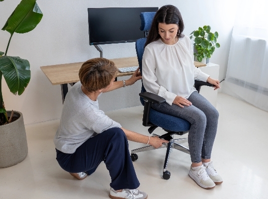 Die Armlehnen sind korrekt eingestellt, wenn Ihre Arme entspannt auf gleicher Höhe zur Tischkante liegen können und so Ihre Schultern entlasten. Der Winkel zwischen Unterarm und Oberarm sollte 90° betragen. Idealerweise wird Ihr Schreibtischstuhl durch einen höhenverstellbaren Schreibtisch ergänzt, den Sie an Ihre Sitzhöhe anpassen können.